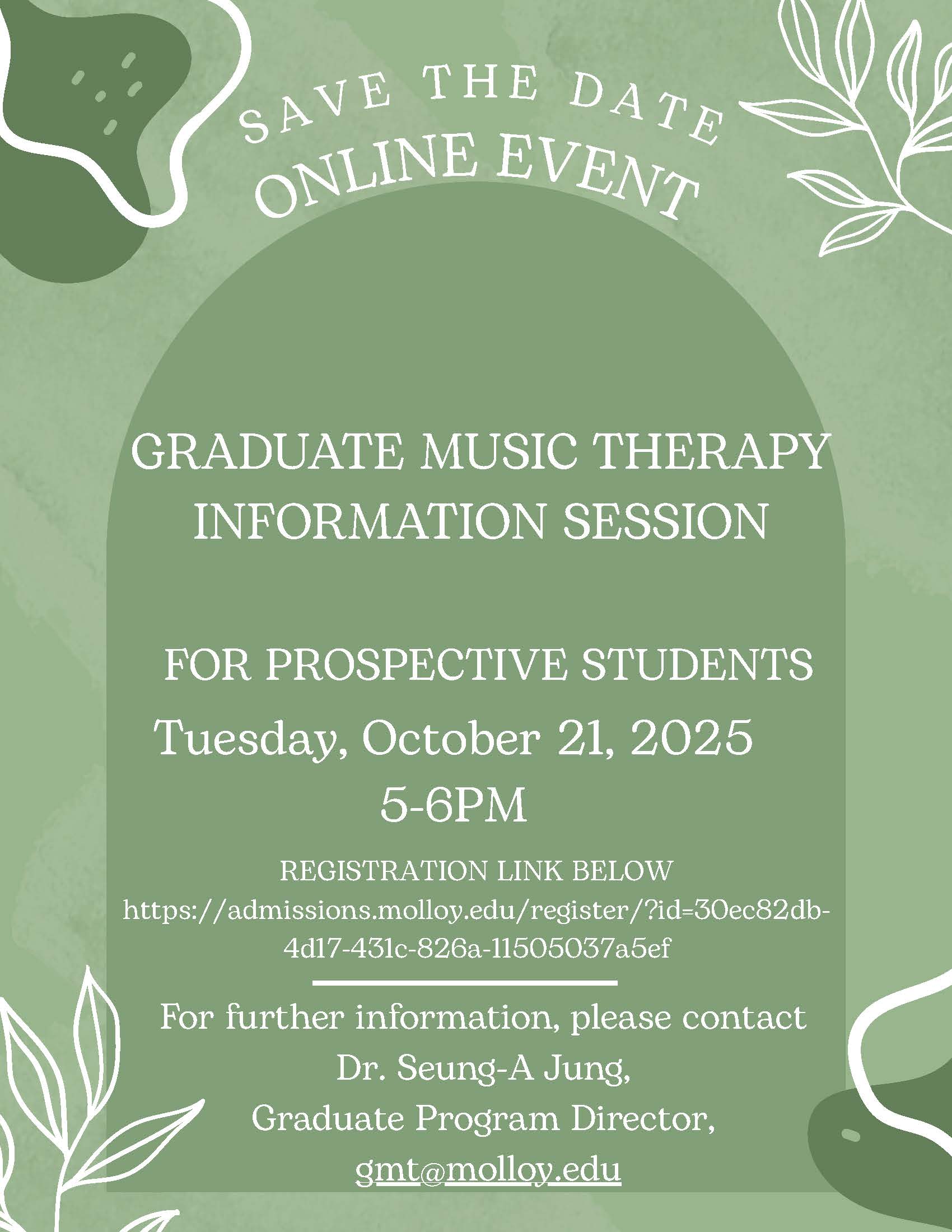 There are many ways to learn more about our program: · Schedule a one-on-one meeting with our Graduate Program director · Schedule a talk with a current graduate student · Observe a graduate Music Therapy class (either in-person or on Zoom) · Attend an upcoming Music Therapy event For more information, please email us at music@molloy.edu